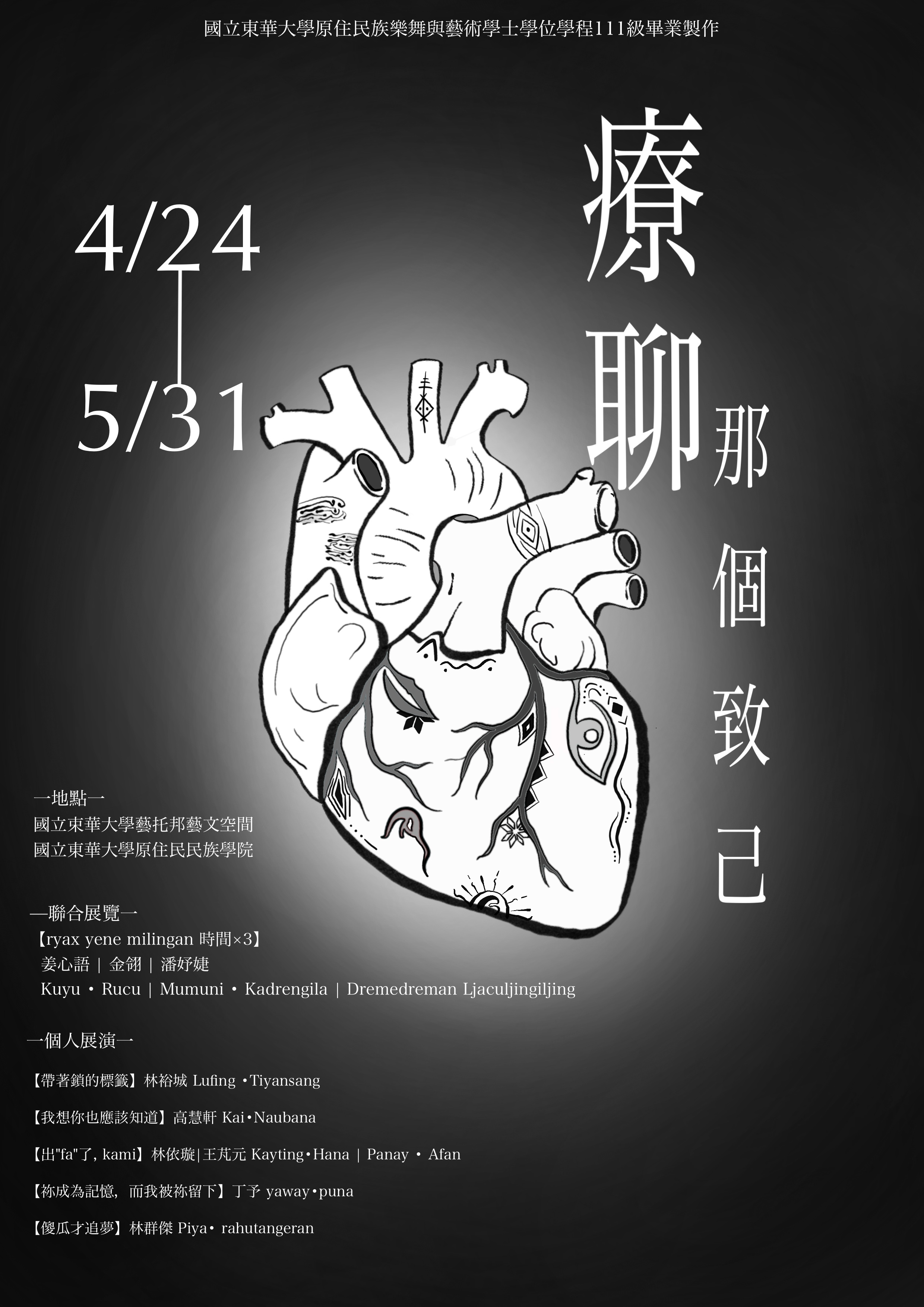 國立東華大學原住民族樂舞與藝術學士學位學程(以下簡稱樂藝學程)將於2026年4月24日至5月31日,在原住民民族學院、藝托邦藝文空間,舉辦111級畢業藝術節《療聊那個致己》。本次藝術節由9位青年創作者共同參與,透過展覽、展演與跨域藝術實踐,呈現9件作品,展現學生4年來在文化養成、生命經驗與自我探索上的累積與轉化。